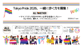 2026年6月7日(日)開催「Tokyo Pride 2026 」のプライドパレードを一緒に歩きたい方を募集します!2026年は「VOICE」「隠れズ」「トランスXコミュニティ」の3団体合同で「ALL TOGETHER」 としてフロート出展します!
