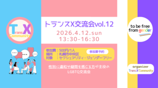 2026年4月12日(日)に札幌でLGBTQ当事者のためのイベント「トランスX交流会」を開催します。トランスジェンダーやXジェンダー、ノンバイナリーの方など性別違和・性別不合の方々をはじめ、セクシャルマイノリティの当事者と理解者のためのイベントです。